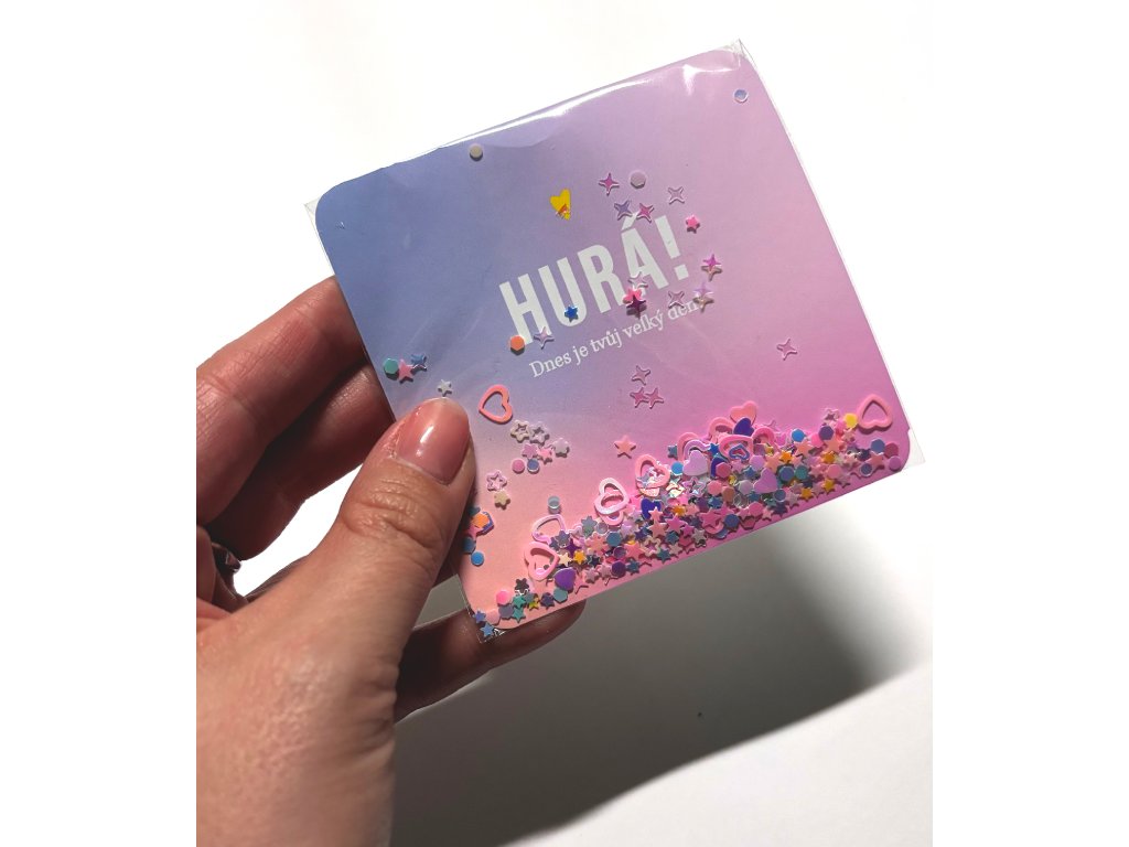 Tohle přáníčko je jako malá oslava ve vašich rukou! 😊 Na nádherném fialovo-růžovém gradientu najdete nadšený nápis "HURÁ! Dnes je tvůj velký den". A pak přijde ta nejkrásnější část - celý spodek sáčku je plný nádherných barevných konfet a třpytek v růžových, fialových, modrých, žlutých a zlatých odstínech, které se při každém pohybu roztančí jako pravá oslava velkého dne.