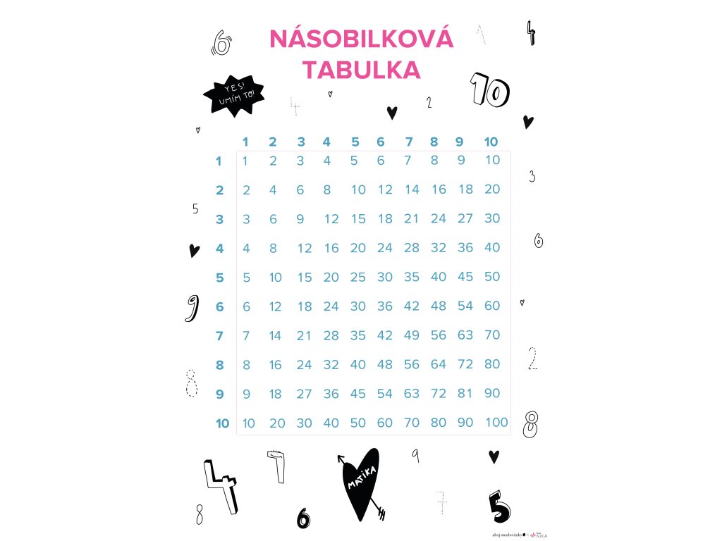 Plakát obsahuje povzbuzující nápis "YES! UMÍM TO!" – připomíná dětem, že násobilku zvládnou a že matematika může být zábava!
