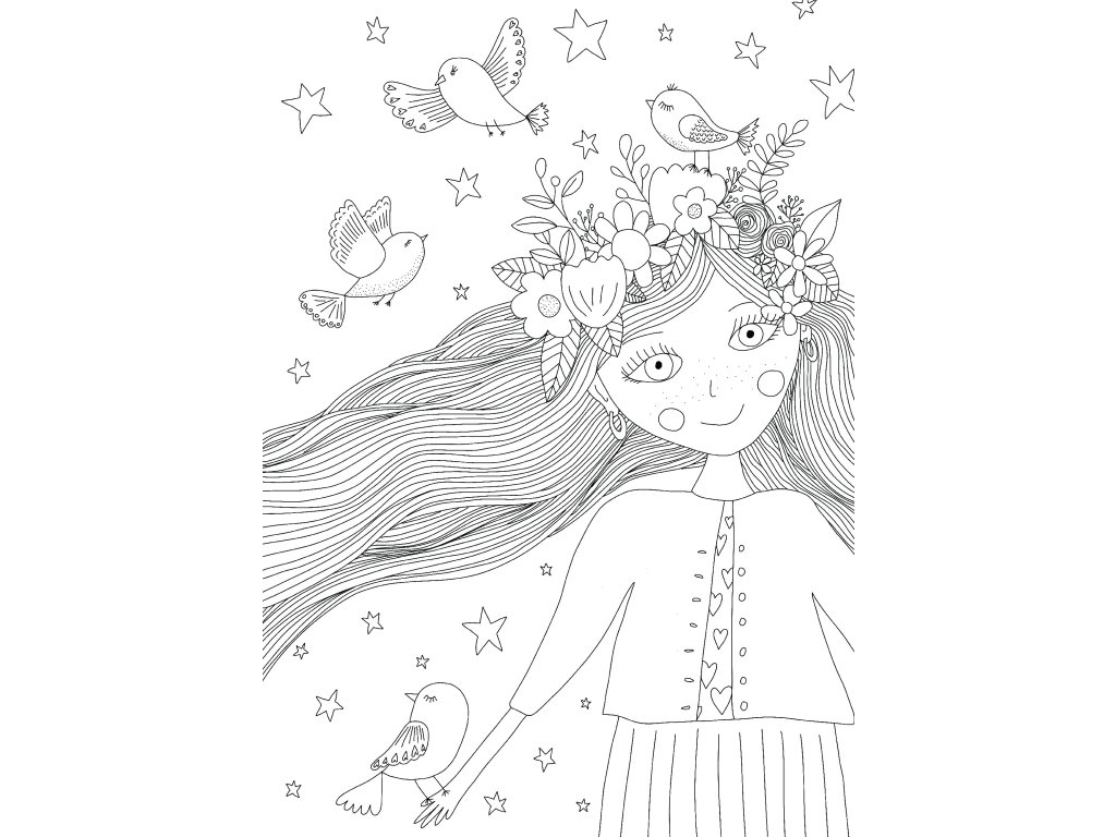 Objevte něžnou krásu dívky s věncem ve vlasech. Tento plakát přináší klid a radost do každého prostoru. Dostupný ve velikostech A2, A1, A0 nebo jako součást sady nejněžnějších omalovánek.