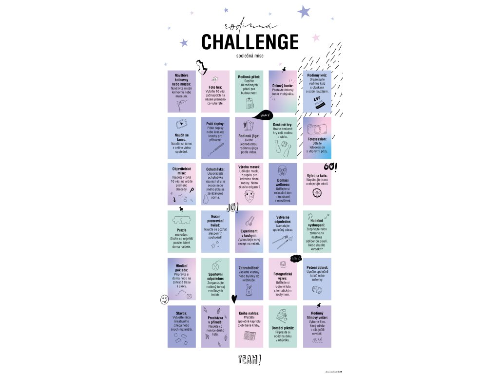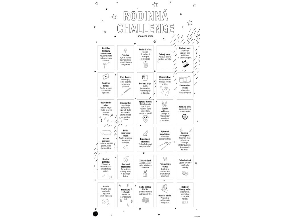 Rodinná Challenge - interaktivní plakát A2 s 30 aktivitami pro celou rodinu. Dostupný v barevné i černobílé verzi, tisk na kvalitní 180g papír. Posílí rodinné vztahy zábavnou formou.