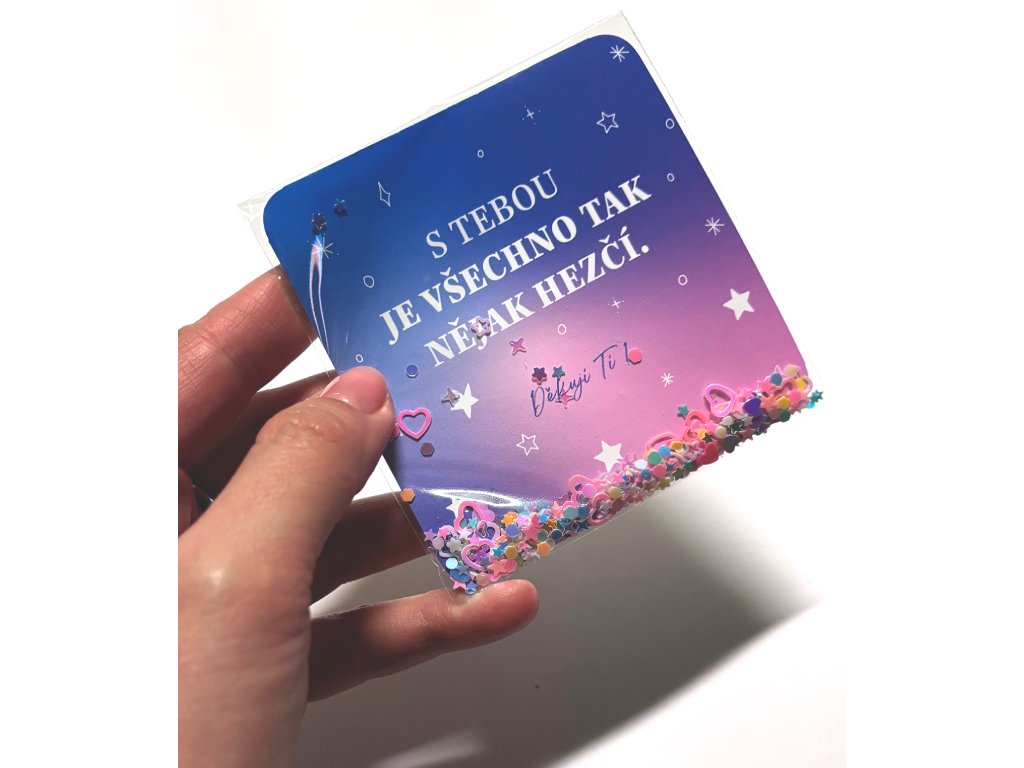 Tohle přáníčko dokáže vyjádřit to nejkrásnější - že někdo dělá náš svět hezčím! 😊 Na nádherném modro-růžovém gradientu najdete něžný nápis "S tebou je všechno tak nějak hezčí" s podpisem "Děkuji Ti ♥" obklopený různými hvězdičkami. A pak přijde ta nejkrásnější část - celý spodek sáčku je plný nádherných barevných konfet a třpytek v růžových, fialových, modrých, žlutých a zlatých odstínech, které se při každém pohybu roztančí jako malé oslavy lásky a vděčnosti.