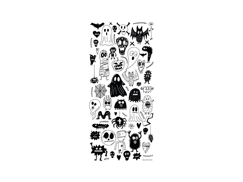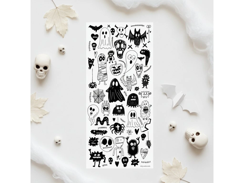 Úžasné nalepovací tetovačky s duchy, netopýry, pavouky a dalšími strašidly! Můžete je nechat černobílé nebo vybarvit tetovacími gelovkami podle vlastní fantazie.