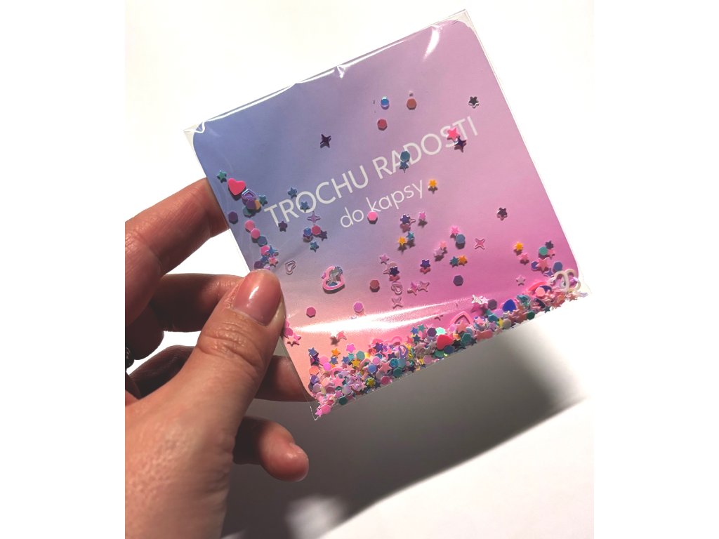 Přáníčko, které nosí radost přímo s sebou! S nápisem "Trochu radosti do kapsy" a barevnými konfetami a třpytkami v celofánovém sáčku s přáním a k tomu krásná průhledná designová obálka.